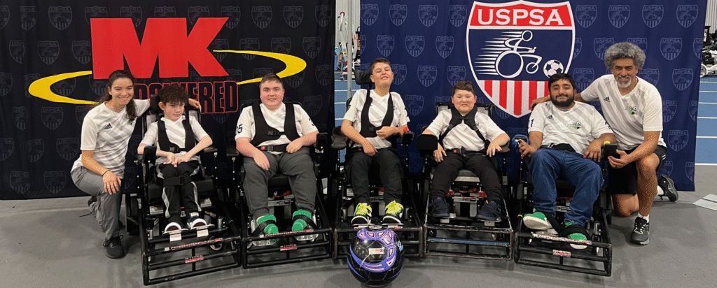 Here is the team members and coaches representing North Texas at the power soccer 2025 MK Battery National conference in Fort Wayne Indiana. From Left to right: Coach Abigail, Sean V. Elijah H. Logan V. Kalel H. Arslan M. and Coach Joseph.